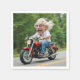 An elderly man with exaggerated features joyfully rides a red motorcycle down a forest road