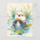 This charming postcard features a sweet, wide-eyed otter peeking out from the ripples of a serene pond. The artwork is created in a loose, expressive watercolor style, utilizing a refreshing palette of sky blue, turquoise, and soft cream. Bright green lily pads and wispy marsh grass surround the otter, accented by delicate yellow and blue paint splatters that add a sense of playful movement. With its cheerful vibe and beautiful painterly textures, this piece captures a moment of pure aquatic joy. Use this postcard to send a sunny hello, a note of encouragement, or a thoughtful message to any animal lover.