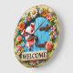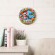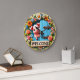 This circular wall clock showcases a charming scene with a smiling pink pig peeking out from behind a blue wooden gate. The gate is surrounded by a vibrant array of colourful flowers including daisies, roses, and bluebells, forming a beautiful floral wreath. A "WELCOME" sign hangs below the pig. The clock is encased in a golden, ribbed frame.