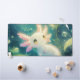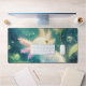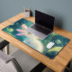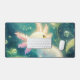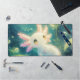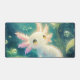 Brighten your desk with this charming whimsical illustration featuring a happy white axolotl with delightful fluffy pink gills and a shimmering translucent tail. This endearing creature glides through a magical glowing pond, surrounded by twinkling sparkling light orbs and playful floating bubbles, creating a truly dreamlike aquatic scene. Lush underwater plants in vibrant shades of green and deep blue frame the background, illuminated by soft, dappled sunlight filtering from above. This ethereal design evokes a sense of serenity and enchantment, perfect for adding a touch of nature-inspired cuteness to any workspace. This desk mat offers versatile use for various other businesses, events, or situations.