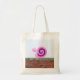 This tote bag design features a depiction of a cute, happy, smiling, pink and purple snail character crawling along the top of a brick wall.