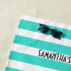 Find your happy place! Personalised slogan towel looks fantastic on the beach or poolside. The striped neon aqua and white colours repeat in wide horizontal stripes. Clean, crisp pattern that brightens even a cloudy day. Gender neutral.