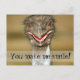 Funny smiling bird postcard with text "You make me smile!" on front.