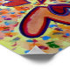 The word "Happy" is painted in a light marigold orange against a rainbow specked background. Hearts of different sizes intersect and float like butterflies around the text.  This painting also comes in a glitter version.