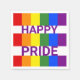 Throw an LGBT Pride party with 3 rainbow flag strips with the words HAPPY PRIDE in bold purple typography between them on a white background. Red, orange, yellow, green, blue, and violet colour blocks go from left to right.