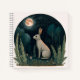 A happy rabbit sits in the moonlight in flowers and other plants with tall trees in the background.