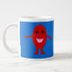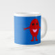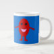 This awesome mug features a cartoon of a smiling red grape with shiny black eyes and a pink mouth standing against a blue background with its arms open wide.