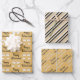 A set of three stylish wrapping paper sheets for retirement gifts. The patterns are: 1) 'Happy Retirement' words in script typography, with two champagne glasses 2) Elegant diagonal stripes 3) 'Retirement Congratulations' in black then white, in script typography.