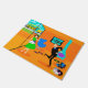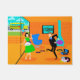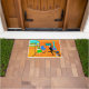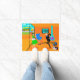 This Happy Retro Parents Door Mat shows a mum and dad rejoicing as their child makes a dash for the school bus. The celebrating duo are in their 1960's style, mid century modern, living room. The orange decor is anything but understated. There is turquoise, cone fireplace and a bright, blue, egg chair against an orange, stone wall. On the wall, there is Mid Century Modern Globe Art Stretched Canvas Print, which is available from StrangeLittleOnion's own Zazzle store. On the floor, there is a blue and black portable record player with several vinyl albums scattered nearby. Dad, is wearing a black suit with a light blue dress shirt and darker blue tie. He is breaking out all of his best dance moves--the kind that would bring eye rolls from junior. Mum is wearing a vibrant, green dress and a flouncy, white apron with blue trim. She is standing in front of sliding glass doors cheerfully waving as her child runs down the front sidewalk towards the waiting yellow school bus. Through the doors, we can see their perfectly manicured, suburban lawn and proverbial, white picket fence. Even the background looks happy with a turquoise sky and the silhouettes of cedar trees. When the kid is away, the parents will play!
