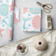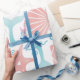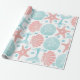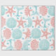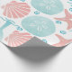 Beach theme Christmas gift wrap features a nautical pattern of seashells and whale tails in tropical turquoise and coral. Original artwork KL Stock.