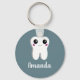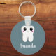 A key chain with a drawing of a big white tooth with a cute kawaii smile and big happy eyes.
