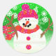 Happy Snowman round stickers features a happy snowman wearing a bright pink and orange winter hat and scarf on a background of green with lots of white snowflakes! Look for the matching snowman holiday greeting cards, address labels, postage stamps, and envelopes!