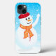 Blue, snowy, winter holiday iPhone case with a happy snowman waving. The snowman is on a separate layer so it can be easily resized or moved.
