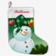 Your kid will be very anxious to hang this Christmas stocking above the fireplace knowing that this cute little snowman with green hat will never melt.