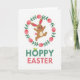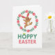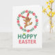 This card shows a warm brown bunny mid-leap, with pink inner ears, rosy cheeks, and a fluffy round tail, smiling with a little tongue peeking out 🐰. Its open arms and bent legs give it the look of dashing in for a friendly hug, like it’s greeting someone it cares about. A circular wreath surrounds the bunny, made of green sprigs and soft pink egg-shaped accents that feel like gentle spring decorations 🌷. The wreath frames the bunny closely, like a tender little spotlight that keeps the focus on its cheerful face. Under the illustration, the text “HOPPY EASTER” sits centered near the bottom edge. “HOPPY” is in green with two small leaves growing from the “O,” while “EASTER” is in rosy pink to match the egg shapes and the bunny’s blush. The background is plain white, and the wreath’s greens and pinks form a neat ring around the bunny.