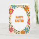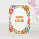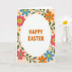 This card features a long white oval centered on a soft peachy-beige background, creating a calm focal area for a friendly seasonal greeting. The main text sits in the middle of the oval in warm orange lettering, easy to spot at a glance. Around the oval, a ring of stylized flowers and leafy vines forms a gentle frame, like a bouquet arranged to lean in close. Petaled blooms in rosy pink, calm blue, and sunny orange cluster along deep green stems, each flower marked with a bright yellow center and an occasional tiny blue dot that feels like a shared secret between friends 🌷. Small leaves tuck between the blossoms, giving the border a cozy, wrapped-around look that reads as affectionate without needing extra words. Across the peach background, a few tiny star-shaped yellow flowers are scattered, adding light decoration that doesn’t crowd the scene 🐰. The overall look stays flat and graphic with crisp edges and clear color areas, and the last detail you notice is the neat sprinkle of those little yellow stars floating around the floral frame.