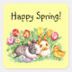Spring Stickers : Cute Spring scene featuring two bunny rabbits, tulips and daisies, a fluffy baby chick, decorated eggs, and the words, Happy Spring! Background colour and text are customisable. A web find enhanced by WebzPickz and 369.