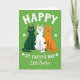 This card shows three stylized cats posed front-facing in a neat row on an emerald green background dotted with small white shamrocks ☘️. In the middle sits a white cat with dark green spots, leaning slightly toward its companions as if enjoying being close. A deep forest green cat stands on the left and a ginger-orange cat on the right, and their gentle smiles and wide yellow eyes give the scene a friendly, affectionate feel 💚. Near the top, the word “HAPPY” appears in large white letters, centered above the cats. Just below that, “ST. CATTY’S DAY” is written in matching white type, also centered and easy to read. Lower down, the phrase “Little Brother” appears in smaller white text, tucked beneath the main greeting. The cats have smooth outlines with light shading, and the shamrock shapes repeat across the green field behind them.