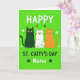 This greeting card features an emerald green background sprinkled with floating shamrocks in white and deeper green, creating a festive St. Patrick’s Day setting ☘️. Three stylized cats stand side by side as the focus, close enough that their shoulders nearly touch, like friends posing for a photo. On the left is a sleek black cat with bright yellow eyes and a tiny orange nose, facing forward with a calm, confident look. In the middle, a white cat is dotted with small green shamrocks, leaning subtly toward its neighbors as if enjoying the company 💚. On the right, a warm orange tabby with gentle stripes wears a small, satisfied smile that feels like a friendly wink to the other two. The word “HAPPY” sits at the top in white sans-serif lettering, while “ST. CATTY’S DAY Nana” appears below the cats in matching white text. Around them, shamrocks of mixed sizes drift across the green field, including both three-leaf and four-leaf shapes.