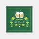 Paper napkins with a festive Happy St. Patrick's Day design with 2 mugs of frosty beer and some clovers on a green background.