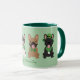 Illustration of three French Bulldog puppies of different colours dressed in St. Patrick Day attire.