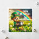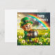 Happy St Patrick's Holiday Card with a Cute Leprechaun holding a Pot of Gold in a field Clovers and a Rainbow