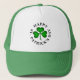A trucker hat with a green shamrock clover design and a black "HAPPY ST. PATRICK'S DAY" text around it.