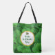 A cute tote bag which says Happy St. Patrick's Day with a background photo of a field with green clovers. A circular frame with a FAUX gold foil border holds the text which is written in a trendy font and contains a green clover illustration.