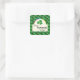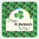 This colourful St. Patrick’s Day square sticker features a green shamrock pattern on black background and the text: Happy St. Patrick’s Day! The text is on light yellow background accented with rainbow colours and a large green shamrock in the middle.