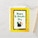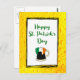 A postcard with a Happy St. Patrick's Day design written in a trendy green font. A frosty mug with Irelands flag colours. The background is a refreshing golden beer texture with big droplets of beer sweat.