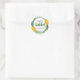 Use these festive stickers on gifts for friends, or to decorate your sukkah. The design features a lulav with etrog, and branches of palm, willow, and myrtle, with pink flowers in a circular layout. The words "Happy Sukkot" are displayed in the centre of the frame.