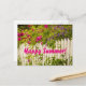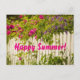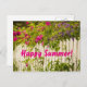 Pink roses bending over a white painted wooden picket garden fence. Summer idyll in a proper cottage garden. Pink roses, purple flowers and green leaves. Hot pink letters and the text written on the white fence: Happy Summer!