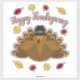 Get festive with this cute holiday vinyl sticker featuring a festive turkey wearing a hat, red and gold fall leaves and an elegant cursive "Happy Thanksgiving" script.