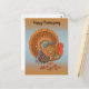 This postcard has a male turkey with feathers in browns and oranges with a fanned out tail standing in Autumn leaves on a blue and burnt orange background. Customize the Happy Thanksgiving text with the template.