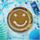 Whipped cream happy face on Thanksgiving pumpkin pie with autumn leaves and gourds on rustic barn wood
