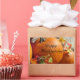 A stack of bright orange pumpkins and colourful fall leaves with the greeting "Happy Thanksgiving".