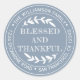 Happy Thanksgiving round return address sticker with your name and address in white stylish typography features the text BLESSED AND THANKFUL in handwritten typography with a stylish touch of rustic foliage on a dusty blue background. Also great for a business thank you to customers! Simply add your business name and address or website. Exclusively designed for you by Happy Dolphin Studio.