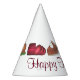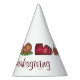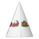 Party hat features a turkey, cranberry sauce, and pumpkin pie, with HAPPY THANKSGIVING in a burgundy font.