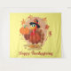 Happy Thanksgiving typography with a Turkey, autumn leaves and pumpkins, to celebrate thanksgiving and be thankful for everything.