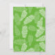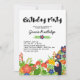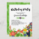 Tropical-themed birthday party invitation in bright colours: red, blue, and green. Birthday Party is written in a charming script. At the bottom, a myriad of colourful tropical flowers, plants, and berries, and a smiling toucan. The back features a green and white front pattern.