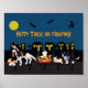 A group of cats and dogs go trick or treating on Halloween Night! The pets in this design include a Akita Inu puppy dressed as a cowboy, a Norwegian Forest Cat with a princess crown, a Siberian Husky pulling a wagon with a pumpkin in it, a Persian cat dressed as an angel, a papillon, a basset hound, a basenji, a Pomeranian dressed as a witch, and a border collie dressed as a police dog. Meanwhile, bats and witches are flying above the neighborhood under a full moon! This design can be customized or personalized by adding your own text or images!