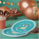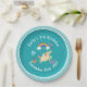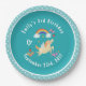 Personalised paper plates for a birthday or shower. Designed with a with a child-like theme. Designed with white polka dots decorating the outer border on a blue green background. A happy unicorn frolicks