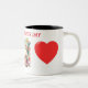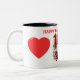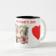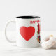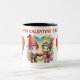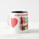 The image shows a white ceramic mug with a black interior. The mug features a colourful Valentine's Day design with two gnomes holding a heart between them. The gnome on the left is wearing a red hat and blue pants, while the gnome on the right is wearing a green hat and dress. Behind the gnomes, there is a large green heart with floral decorations. The text "HAPPY VALENTINE'S DAY" is written in red at the top of the mug.