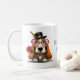 This adorable basset hound-type puppy wants to know "Will you be my Valentine?" There are two images, one on each side of the mug. Text is in between the images and can be changed. AI assisted graphic purchased with commercial use. Artwork: RedHeronLighthouse