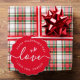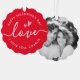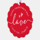 Ornament card featuring the text "love" in an elegant script font with two cute, pink hearts above. Customisable name and text "Happy Valentine's Day". Red or custom colour background. Add a custom photo on the back.