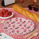 Illustration of three French Bulldog puppies of different colours popping out of hearts dressed in Valentine's Day attire.