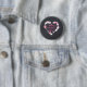 A button badge with a cute illustration with a bunch of little pink glittery hearts forming a heart-shaped frame. Inside it says happy Valentine's Day in a trendy whimsical font. Set on a black chalkboard background.