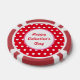Red background with white polka dots... white centre circle with red lettering... and pink accents...