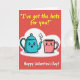 This Valentine’s Day card shows a teal teapot and a pink mug drawn like cute little characters, sitting together on a soft, white cloud shape. The teapot has a wide open smile and rosy cheeks, and black steam curls up from its spout as it leans toward the mug. The mug looks shy and sweet with a blush on its face, as if it’s flattered by the attention. The background is a flat, bright red that makes the teal and pink colors stand out clearly. At the top, the card says “I’ve got the hots for you!” in sunny yellow block letters, like a fun headline above the pair. Near the bottom, “Happy Valentine’s Day!” appears in rounded white letters that are easy to read and feel friendly. Altogether, it’s a simple, warm design that mixes a silly pun with real affection ❤️💌🍫. Hope it helps you share kind Valentine’s Day feelings with someone you care about.