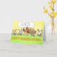 This card shows the drawing of a thanksgiving dinner. The guests are a turkey and four bunnies. The turkey is sitting in the middle. It is raising its glass to make a speech or a toast. Over it is a speech bubble that reads "I'm grateful you are all vegetarians." The bunnies are eating. On their plates you can see carrots, corn and mashed potatoes. The tablecloth is green. On it is written "Happy ThanksGiving".
